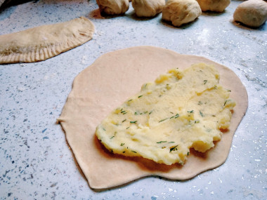 Очень люблю чебуреки с любыми начинками, но готовлю их редко. А на фотографии были такие красивые и аппетитные чебуреки...Тоже захотелось такие) Оказалось, по этому рецепту готовить их совсем не сложно, я думаю, любая хозяйка справится. Начала с начинки, сразу поставила вариться картошку. Тем временем замесила тесто. Муки у меня ушло немного поменьше, тесто легко замесилось и скаталось в шар. За время пока варилась картошка, тесто успело отдохнуть. Я его поделила на десять кусочков. Старалась раскатывать потоньше, хотя тесто немного тугое. В картошку молока чуть больше добавила, чтобы начинка легко размазывалась. Чебуреки лепила сразу по две штуки и быстро обжаривала на сковороде. Они получились румяные, красивые. Внутри мягкая начинка с ароматным укропом, а снаружи хрустящее тесто. Мне напомнило жареные вареники) Хоть чебуреки получились сытные и большие, съели их мгновенно! Они действительно вкусные, рекомендую!