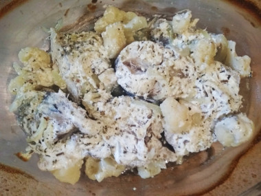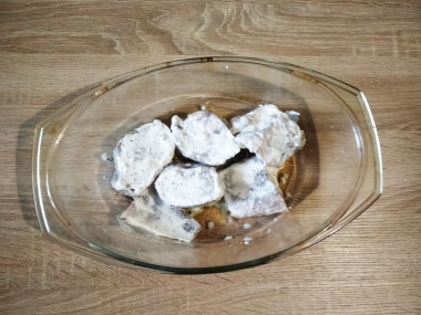 3. Филе хека режем на крупные кусочки, выкладываем на сметанную смесь, посыпаем специями.