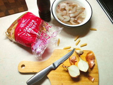 2. Разогреваем сковороду в оливковым маслом, выкладываем в него креветки, добавляем измельченный чеснок, соль, перец.