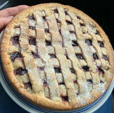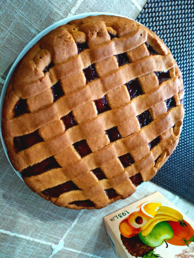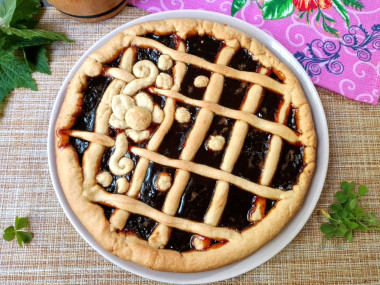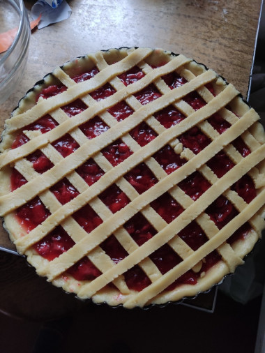 Оставшуюся часть песочного теста раскатайте в тонкий пласт и порежьте ленточками. Полученные ленточки теста выложите на поверхность начинки в виде решетки.