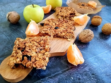 Муж попросил сделать ему что-то сытное и полезное на перекус. И вспомнила я, что когда-то частенько запекала мюсли. Но они были рассыпчатые. А на сайте видела несколько рецептов полезных батончиков. Выбрала среди них злаковый батончик мюсли. Порцию делала большую, на 400 г. геркулеса. Из добавок взяла семена подсолнуха, грецкие орехи и изюм. Как и указано в рецепте, бананы размяла вилкой, а яблоки натерла на терке. От себя добавила в овсяную массу пару ложек меда, он придаёт приятный аромат, сладость и небольшую вязкость. Массу выложила на большой противень, застеленный пергаментом. Чтобы пласт получился ровным, придавливала его разделочной доской. Запекала 25 минут до румяного цвета. По краям пласт немного подсох, эти места я обрезала. Остальное нарезала на квадраты. Батончики получились хрустящие, внутри немного тянутся. Очень приятные на вкус. Единственное что не понравилось, это изюм. На поверхности батончиков он вздулся и пересох. Поэтому в следующий раз заменю его на курагу или вяленую вишню. Батончики удобно брать с собой на работу или добавить к завтраку.