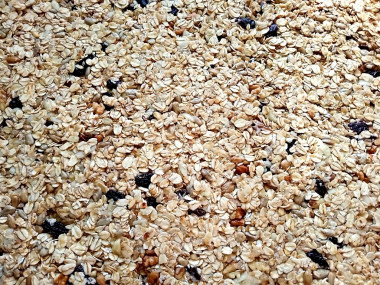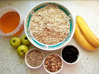 Хлопья всыпьте в глубокую миску, выложите к ним банановое пюре. Перемешайте. Всыпьте семечки и орехи. Крупные орехи предварительно измельчите, ножом или в ступке. Для раскрытия вкуса вы можете немного подсушить орехи на сухой сковороде. Изюм (или другие сухофрукты) промойте, обсушите, откинув на сито и также добавьте в миску к хлопьям. Крупные фрукты нарежьте на более мелкие. Еще раз перемешайте хлопья со всеми добавками.