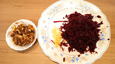 Грецкие орехи слегка подсушить на сковороде или в духовке примерно 10-15 минут, время от времени перемешивая. Измельчить руками в емкость к натертой свекле. Можно поместить орехи в пакет и, завязав его, побить кулинарным молоточком, измельчая их в крошку.