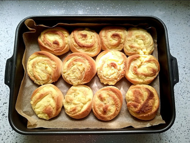 Красивые дрожжевые булочки завитушки получаются невероятно мягкими и пушистыми, по вкусу они как ватрушки, только намного сочнее за счет сметанной заливки. Приятного аппетита!