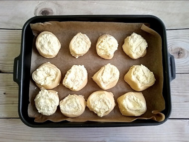 Возьмите подходящую форму для выпечки. Это может быть большой противень или несколько форм для запекания. У меня получилось две формы, одна размером 31*17 см, другая 20*20. Я снимаю только одну. Застелите формы пергаментом, так будет лучше, чтобы не подгорела творожная начинка. Чтобы бумага ложилась в форму, сомните ее руками. Выложите в форму завитушки. Те булочки, которые были с краев рулета, положите срезом вверх.