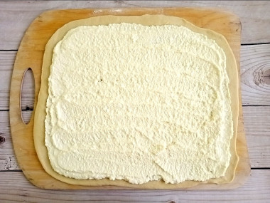 Смажьте его творожной начинкой, не доходя по 1 см с двух коротких сторон и с одной длинной.