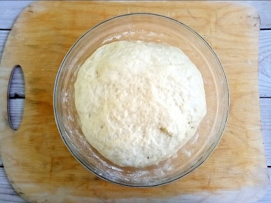 Через час тесто должно будет увеличиться в объеме в два раза. Слегка обомните его и выложите на рабочую поверхность. Мукой присыпать ее не надо, тесто совершенно не липкое.