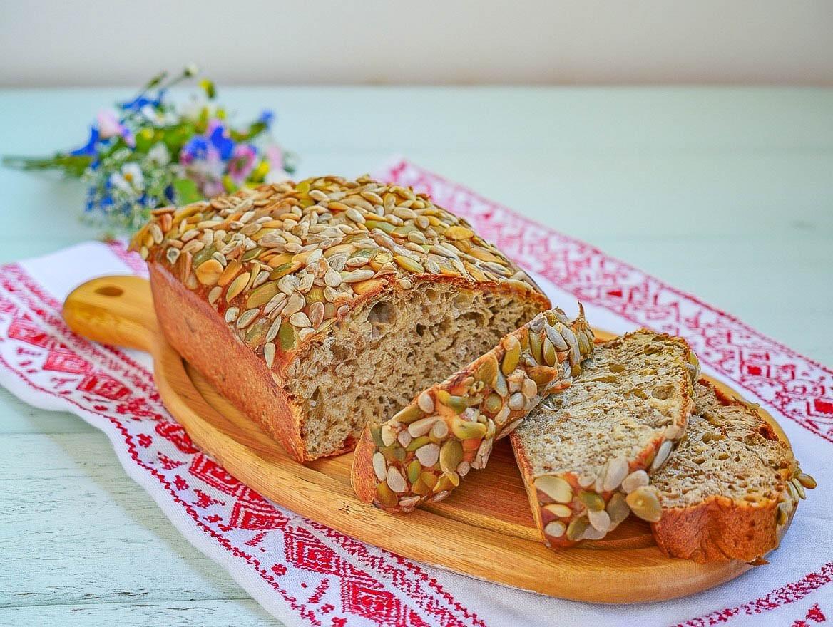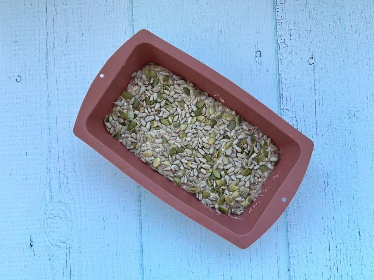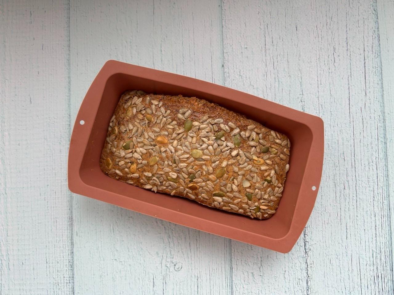 Переложите тесто в форму (у меня 20х12 см), сверху посыпьте семечками и слегка прижмите руками. Поставьте хлеб в заранее разогретую до 175 градусов духовку на 45-50 минут. Точное время будет зависеть от особенностей работы вашей духовки. Готовность проверьте шпажкой - проткните ей хлеб в нескольких местах. Если шпажка выйдет сухой, значит хлеб готов. Подробнее о духовках и формах для запекания читайте в конце рецепта.Шаг 5. Как правильно остудить хлеб перед подачей?