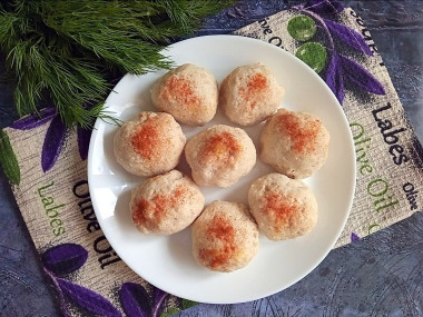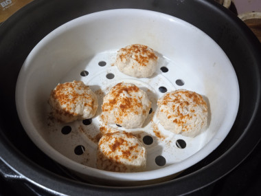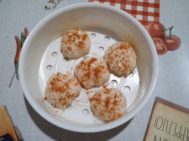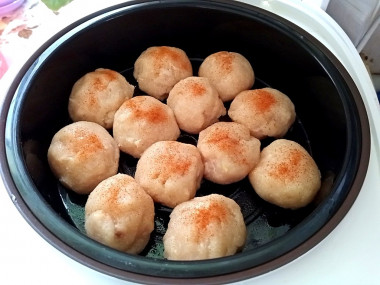 Все пропорции соблюдала. Куриную грудку измельчала в блендере, это очень удобно. Вместе с мясом выложила в чашу лук, яблоко, манку, соль и паприку. Все вместе отлично замесилось в однородный фарш. Мне некогда было готовить вечером, поэтому убрала миску с фаршем в холодильник до утра. За свежесть не переживала, т. к. в нём нет яиц и молочки. Утром фарш набух и приобрёл хорошую плотность. Набирала его столовой ложкой и формировала мокрыми руками. Сверху слегка посыпала заготовки паприкой. В воду добавила лавровый листочек для аромата и готовила на пару 30 минут.
