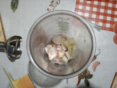 Филе порежьте небольшими кусками. Прокрутите его через мясорубку или воспользуйтесь блендером-измельчителем. Я выбрала второе. Вместе с мясом измельчите лук и яблоки. Должна получиться однородная масса.