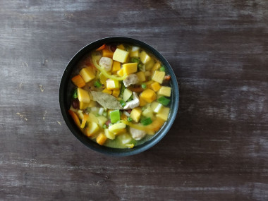 С тыквы снимаем кожуру, вынимаем из нее мякоть, семечки и нарезаем ее кубиками. Бобы, горох, стручковую фасоль можно взять, если есть, замороженные. Свежий болгарский перец нарезаем соломкой либо также используем заморозку.