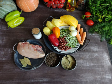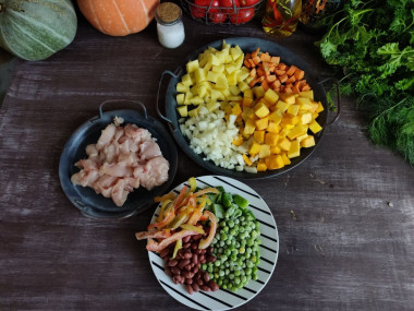 Готовим ингредиенты. Возьмем в качестве овощей для овощного соте – тыкву, болгарский перец, картофель, морковь, репчатый лук, бобы, горох, стручковую фасоль. Если есть кабачок, помидоры, баклажан, можно добавить и их, они обогатят вкус блюда и сделают его еще питательнее. В качестве мяса возьмем пару куриных бедрышек. Кроме того можно менять состав овощей в зависимости от наличия и вкуса, курицу можно также использовать полностью или какую-то определенную