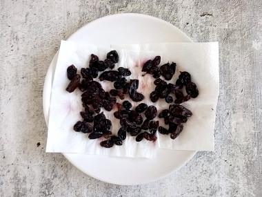 Изюм для кекса выбирайте мелкий, без косточек. Сначала тщательно промойте его теплой водой, удаляя мусор и кисточки. Затем залейте изюм кипятком и оставьте на полчаса. По прошествии времени воду слейте, а изюм выложите на бумажное полотенце, чтобы убрать лишнюю жидкость.