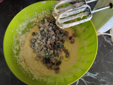 Затем всыпьте в массу просушенный распаренный изюм. Перемешайте заготовку теста, чтобы изюм равномерно распределился по нему. Изюм перед добавлением можно обвалять в муке, так он лучше распределиться по тесту.
