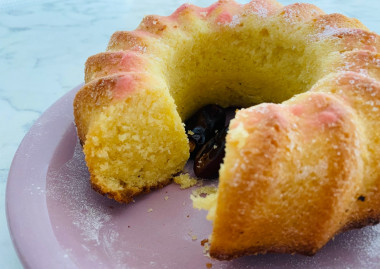 Кекс очень нежный, таящий во рту. Описание кекса соответствует реальности. И очень сочный. Сверху посыпала розовой пудрой на остывший кекс, но от того, что кекс сочный пудра растаяла, а в серединку положила финики.