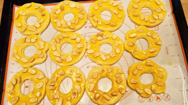 Смажьте кольца взбитым яичным желтком и посыпьте орехами. Уложите кольца на противень, устланный бумагой для выпечки. Поставьте их в морозильник на 15-20 минут.