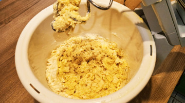 Всыпьте всю муку и перемешайте тесто за 15 секунд на минимальных оборотах миксера. У вас получится песочная крошка.