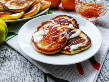 Выкладывайте оладьи на бумажное полотенце, чтобы удалить с них лишнее масло. Сытные, ароматные и очень вкусные оладьи можно дополнить джемом или сметаной. Приятного аппетита!