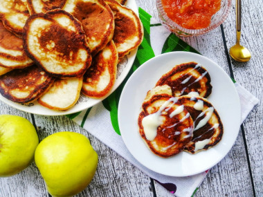 Подавала оладьи со сгущённым молоком и яблочным джемом. Сгущёнка добавила сладость и приятный сливочный вкус, яблочная кислинка отлично оттенила вкус оладушек и придала пикантность.