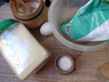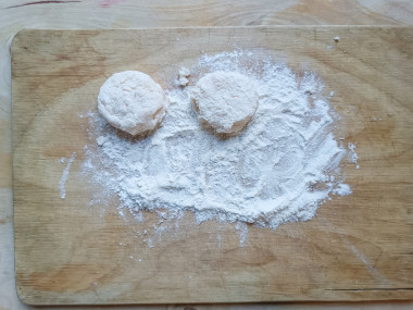 На тарелочку насыпьте пшеничную муку, манку или панировочные сухари. Смоченными в холодной воде руками сформируйте небольшие оладушки из манной массы и обваляйте их в панировке. Я одну партию манника сделала с мукой, вторую – с манкой. В первом случае манник получился более мягким и нежным, а во втором – лучше держал форму, корочка получилась более плотной, а сам манник вышел сухой на вкус.