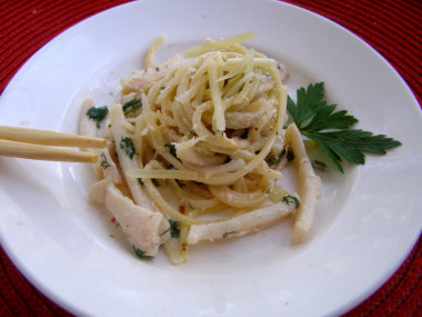 Макароны с кальмарами в сливочном соусе уместны в любое время суток, даже вечером. Готовятся за минуты - ровно столько, сколько варятся макароны. Это будничное блюдо, идеальное для ужина! Спасибо за рецепт!