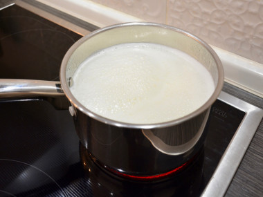 Гурьевская каша — это манная каша, которая сначала варится на плите, а затем запекается в духовке. Первым делом сварите кашу. В сотейник влейте молоко, всыпьте сахар простой и ванильный.