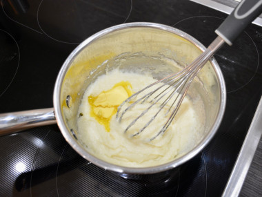 Уберите сотейник с огня. Добавьте в кашу сливочное масло и перемешайте до однородности.