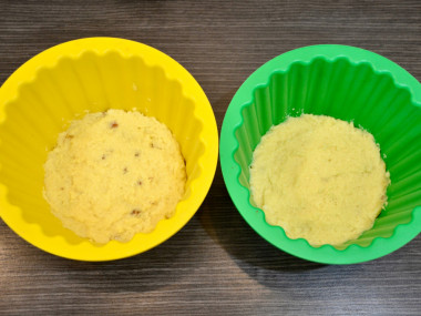 Возьмите подходящие для запекания формочки. Или одну большую, или порционные. На дно формочек выложите немного манной каши.