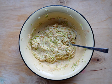 Все ингредиенты хорошо перемешайте между собой. Консистенция кабачковой массы получается не жидкая и не густая.