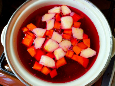 Свеклу, морковь и яблоко кладем в кастрюлю с толстым дном, заливаем водой, чтобы она закрывала овощи и фрукты. Ставим на огонь, доводим до кипения, убавляем огонь до среднего и варим, пока яблоко не станет мягким.