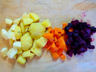 Вареную свеклу чистим, нарезаем на крупные кусочки, морковь чистим, также делим на куски.