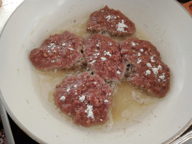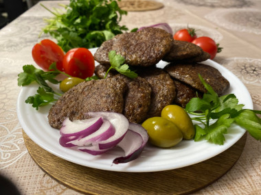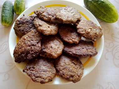 Внутри оладьи должны быть коричневатого цвета. В первые минуты обжарки может выделяться кровь. В хорошо прожаренных оладьях крови быть не должно ни внутри, ни снаружи (если только вы не предпочитаете именно такую степень прожарки). Готовые оладьи переложите на блюдо и подайте к столу. К ним подойдет абсолютно любой гарнир. Приятного аппетита!
