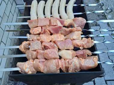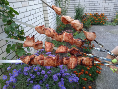 Обжарьте шашлык на мангале, над раскаленными углями, в течение 15-20 минут. Обязательно следите за жаркой, вращайте шампура, чтобы мясо прожаривалось равномерно. Влейте в оставшийся маринад 100 мл воды и время от времени поливайте им шашлыки, чтобы они не стали сухими в процессе жарки.