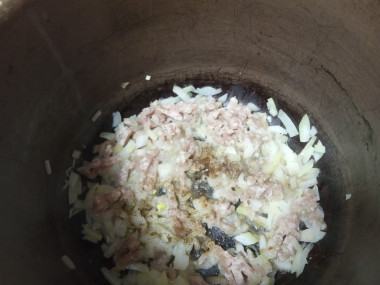 Лук очистите и мелко нарежьте. На сковороде разогрейте растительное масло, выложите в него лук. Обжарьте лук на небольшом огне пару минут, затем добавьте к нему фарш и хорошо перемешайте его с луком. Обжаривайте все вместе несколько минут, чтобы фарш поменял цвет. Периодически его перемешивайте. Процесс обжарки вы можете также сделать и в самой мультиварке, если у вас есть такая функция в ней.