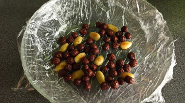 . Визуально прикинула, какой салатник подойдёт под объем, застелила его внутри пищевой пленкой, насыпала на "дно" немного миндаля и шоколадных шариков для украшения и выложила тортовую массу плотно-плотно сверху. Получилось как раз! Сверху накрыла плоской тарелкой, все перевернула и поставила настаиваться в холодильник.