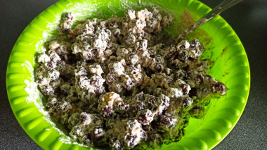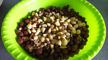 В миску с кремом выложите шоколадные шарики и измельченные грецкие орехи. Помимо орехов можете добавить в торт сухофрукты (изюм, измельченную курагу или чернослив, вяленую вишню или клюкву).