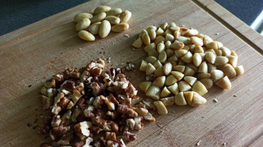 Затем мелко порубите орехи ножом. Грецкие орехи можете заменить на любые другие по своему вкусу: фундук, пекан, кешью и т. д.