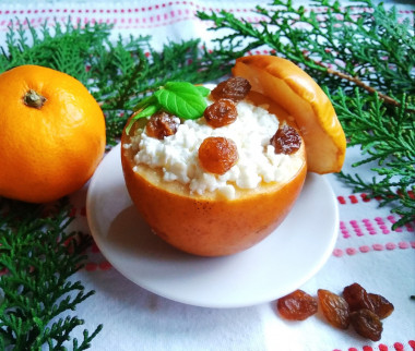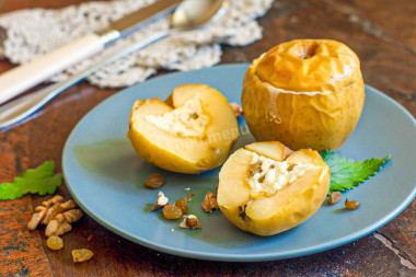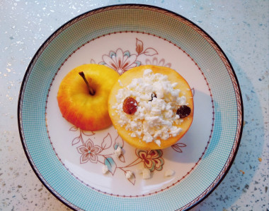 Я тоже считаю, что запеченные яблоки являются диетическим продуктом, поэтому периодически готовлю их на десерт. Правда запекаю их просто так целиком без добавок. Захотелось немного разнообразить рецепт и добавить начинку. Творог вполне подходящий для этого, да еще и с изюмом) Яблочки запекаются с крышечкой, это красиво выглядит) Запекала пару яблок 20 минут, чтобы они не развалились. Готовые яблоки получились слегка мягкие, но хорошо держат форму. Сладкий творог похож на запеканку, а изюм не успел распариться, что мне очень понравилось, люблю когда он немного жестковатый. Десерт вкусный и полезный, подавала его в горячем виде. Получилось вкусно!
