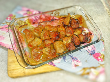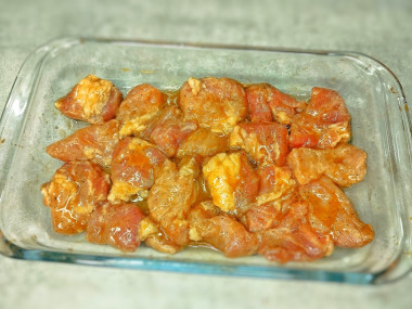 Выложите маринованное мясо на промасленный противень. Запекайте до готовности при температуре 180-200 градусов в течение 60 минут.