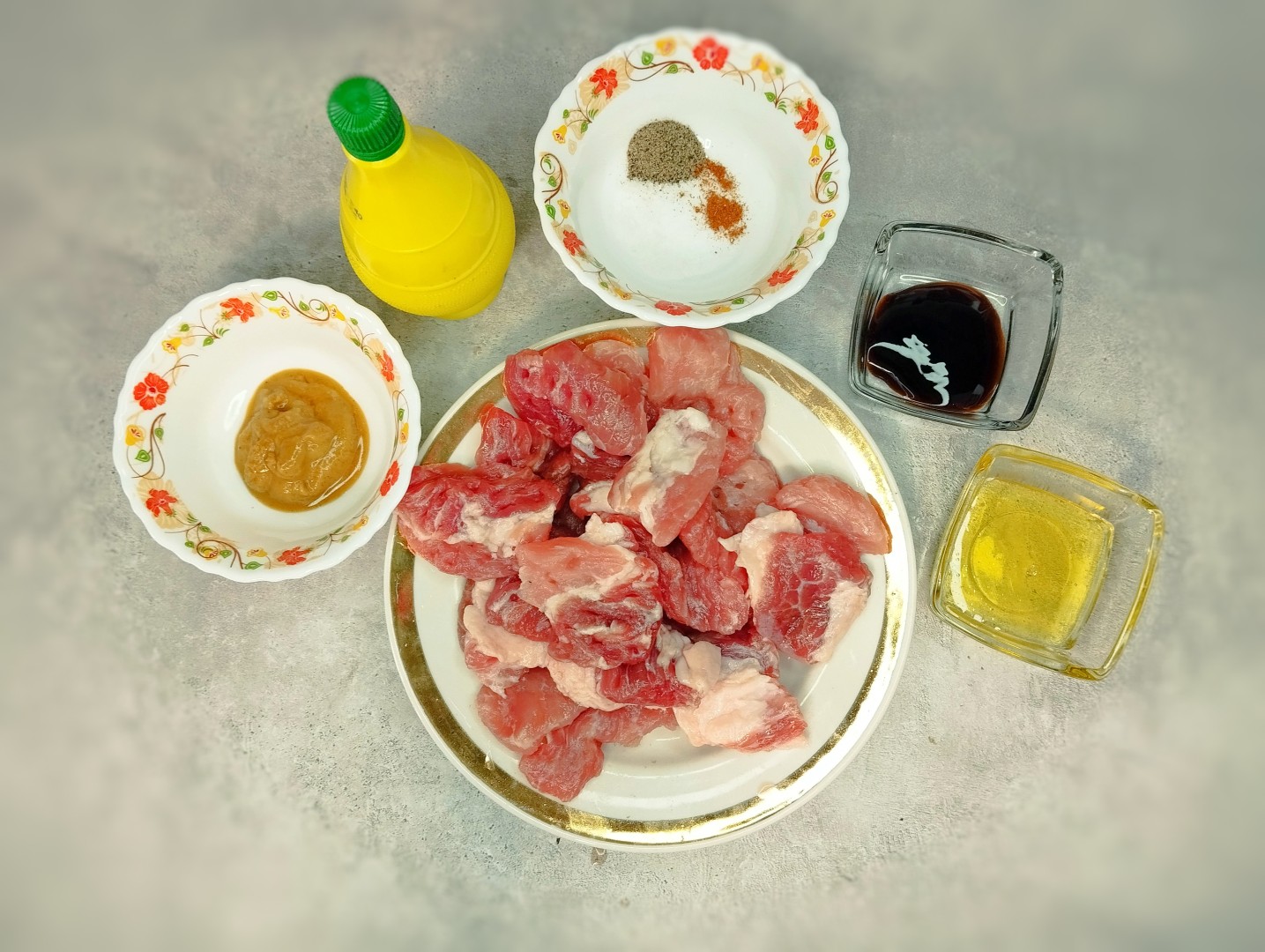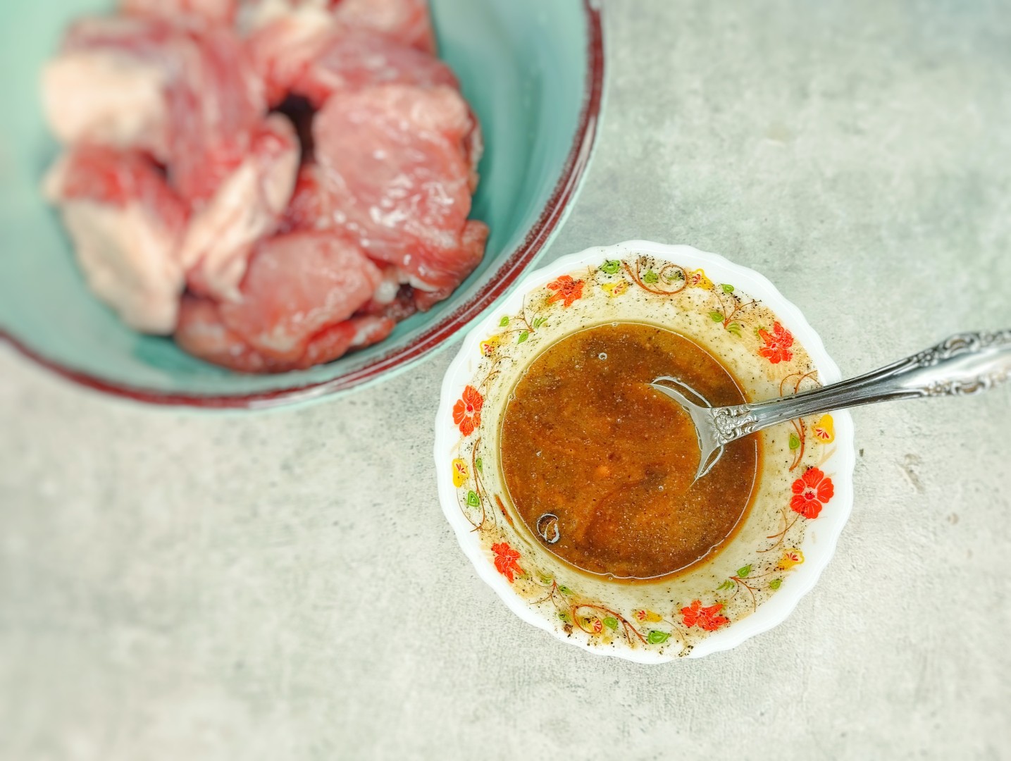 Каждый кусочек в специях обволакиваю и кладу в маринад. А маринад - просто все ингредиенты миксером перемешиваю. А само мясо на углях, не в духовке. Оно еще жарится необычно, выглядит снаружи как сырое а внутри уже готово, можно перепутать и вытащить поздно, когда вся сочность пройдет