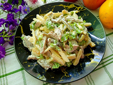 Меня очень заинтересовал состав салата с бужениной и солеными огурцами. Захотелось попробовать на вкус. Только вот буженина дороговато стоит, поэтому рискнула заменить ее на запечённую свинину. Огурчики у меня собственного посола, не сильно соленые и острые. Яблоко только сладкое было. Мясо, огурцы и яблоко нарезала соломкой. Ну и листья салата "лапшой" нарезала. Даже не ожидала, что получится так вкусно! Соленый огурец и сладкое яблоко так интересно сочетаются) Салат получился необычный, непривычный для нас, но при этом очень вкусный. Мне бы хотелось в него ещё маринованных грибов добавить) Мясо пропитавшись майонезом стало намного мягче и нежнее и в общей массе особо не выделялось по структуре. Соглашусь с автором, что салат сытный. Его можно подать как самостоятельное блюдо)