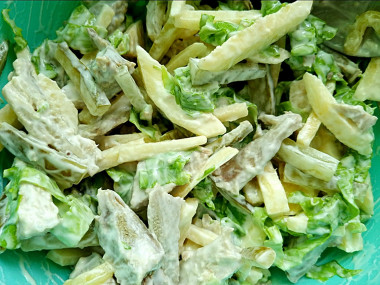 Также в качестве заправки можно использовать не только майонез, но и сметану или натуральный йогурт. Их можно взять по отдельности либо смешать с майонезом в любой пропорции на свой вкус - это снизит калорийность блюда.