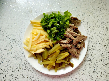 Огурцы также нарежьте соломкой. Листья салата хорошо промойте под проточной водой, обсушите бумажными полотенцами и точно так же нарежьте тонкой соломкой.