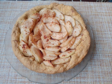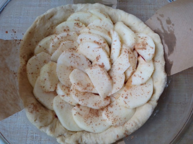 Раскатанное тесто выложила в форму, смазала немного джемом из алычи и выложила сверху дольки яблока. Присыпала их сверху сахаром и молотой корицей.