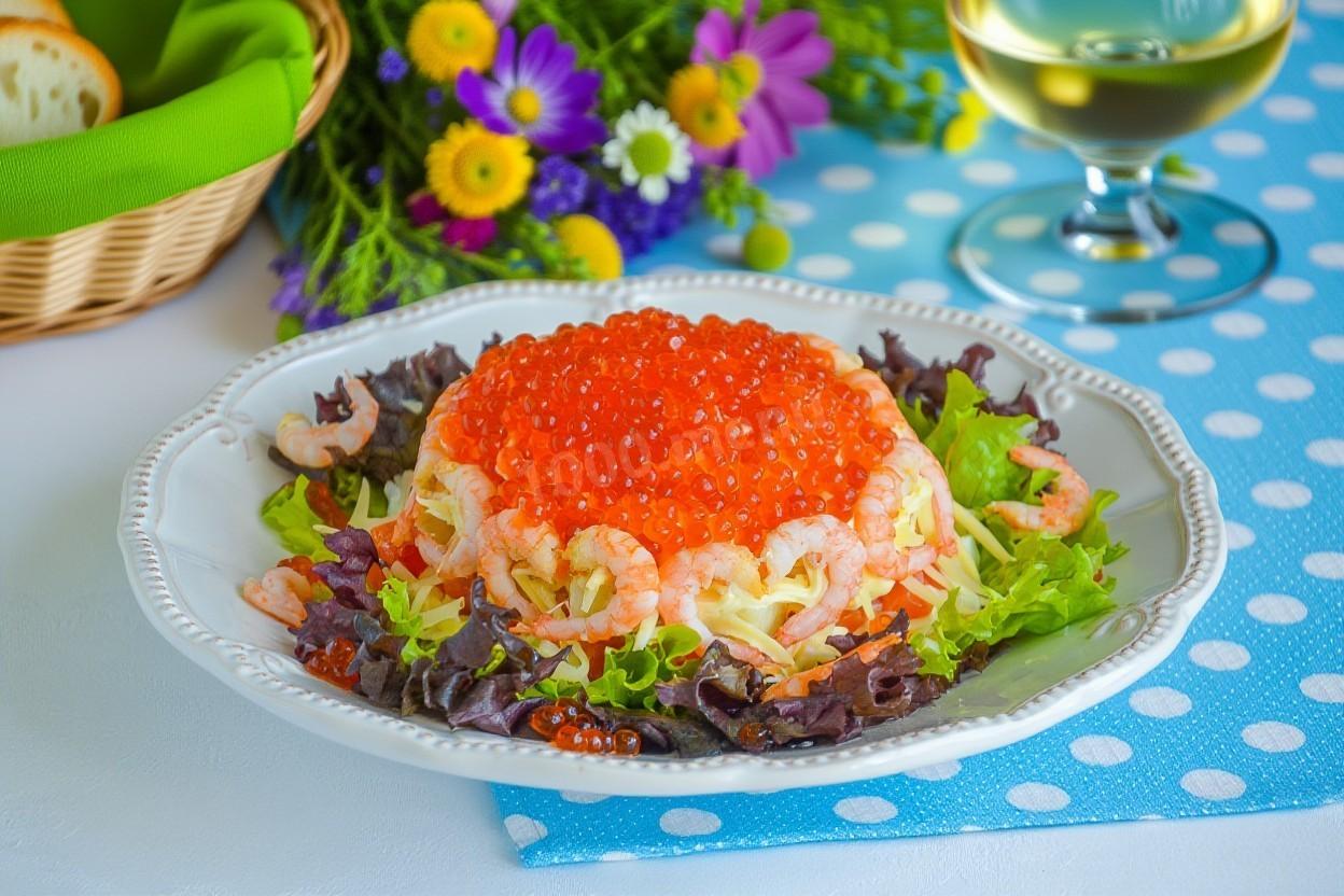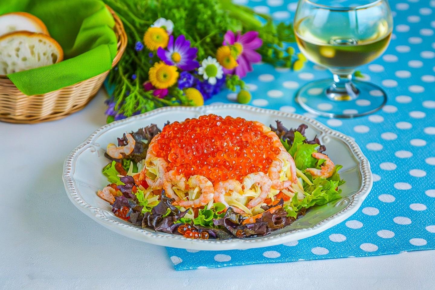 По периметру выложите целые креветки, а в центре сделайте нарядную "шапочку" из красной икры. Перед подачей дайте салату 1-2 часа настояться в холодильнике. Приятного аппетита!