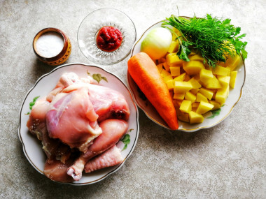 Калорийность продуктов: Курица, Картошка, Вода, Лук, Морковь, Растительное масло, Карри, Паприка, Зира, Перец черный молотый, Соль, Укроп, Петрушка