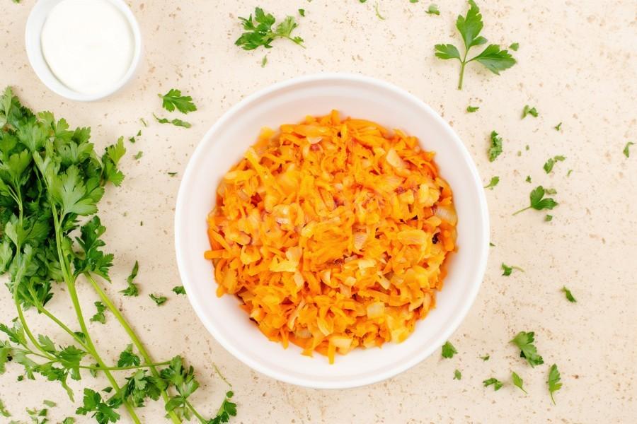 Лук порежьте мелкими кубиками, а морковку натрите на мелкой терке. Пассеруйте овощи на растительном масле на сковороде на среднем огне до мягкости. На это уйдёт примерно 1-2 минуты.