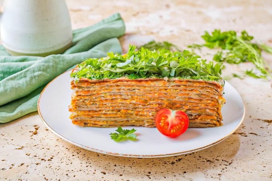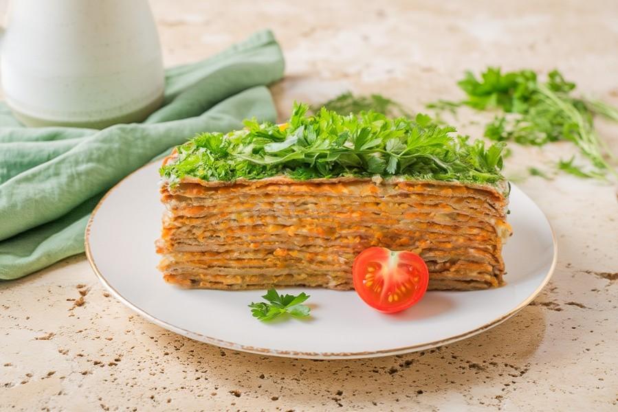 Слои блинчиков на основе измельченной нежной куриной печени, смазанные майонезом и овощами- очень вкусная, быстрая и совершенно простая закуска на любой день, которая получится у любого. Не жалеем зажарки, тертые морковки и луковицы тушим до мягкости и сочности, выкладывая на слой майонеза, чередуя и формируя тортик. Рекомендую в конце обрезать края торта кольцом, для формирования идеального и аккуратного вида. А измельченный укропчик с верху придаст завершающий, свежий и аппетитный вид. Это не просто еда, это воспоминание о теплых семейных вечерах и о праздничных застольях. Готовьте данное блюдо и все останутся довольны нежнейшим вкусом печеночного торта.