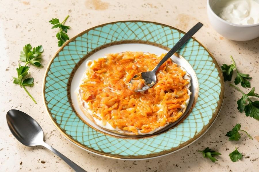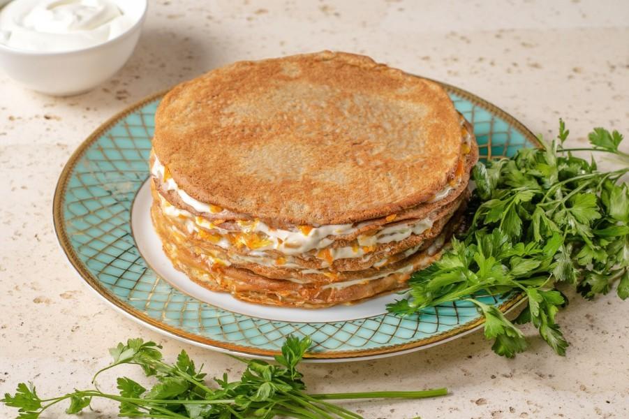 Возьмите один блин, смажьте его майонезом, положите тонкий слой морковно-луковой зажарки, сверху накройте следующим блином. Повторяйте действия, пока блинчики не закончатся. Майонез можно использовать как покупной, так и домашний. Рецепты найдете после описания последнего шага.