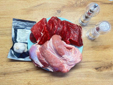 Промойте говядину в воде, обрежьте пленки и жилы, с сала срежьте кожу. Нарежьте и мясо, и сало средними кубиками. Очистите чеснок от шелухи и промойте. Если хотите, можете добавить в фарш и репчатый лук, очищенный, промытый и нарезанный, но если вы хотите заморозить заготовки колбасы в кишке на будущее, то лук добавлять не рекомендуется! Пропустите все нарезки через мясорубку, установив насадку с крупными или мелкими ячейками.